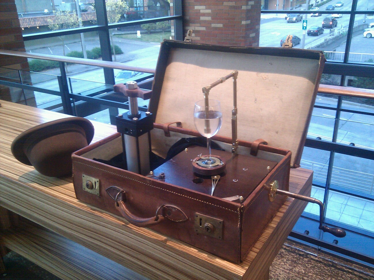 Glass rotation is achieved by means of a 1920s phonograph motor which was restored for this purpose. Future plans include modifying the motor governor to reduce the speed in order to reduce unnecessary centrifugal effects on the water.